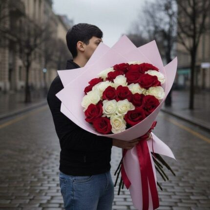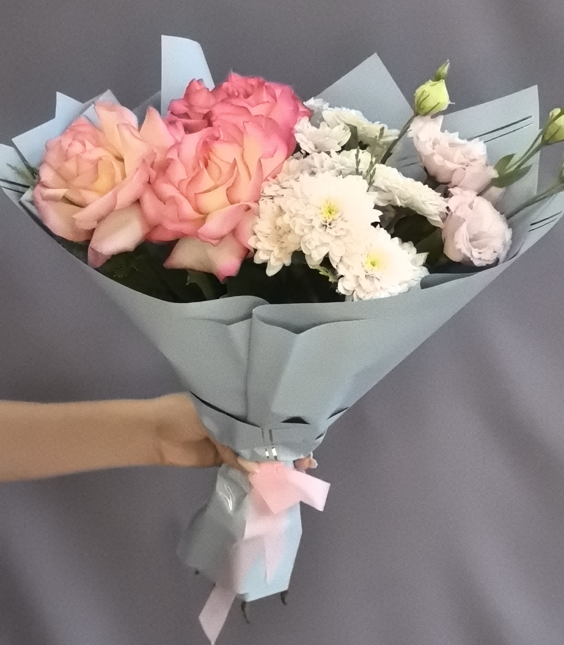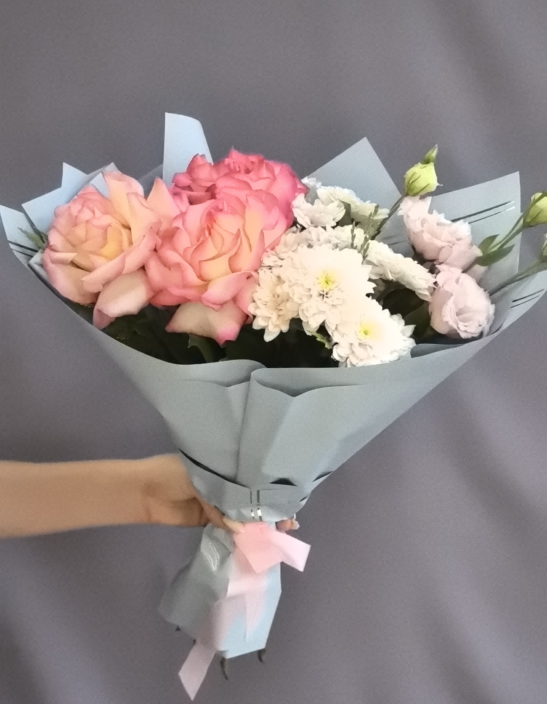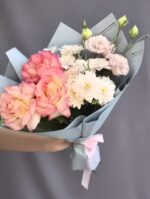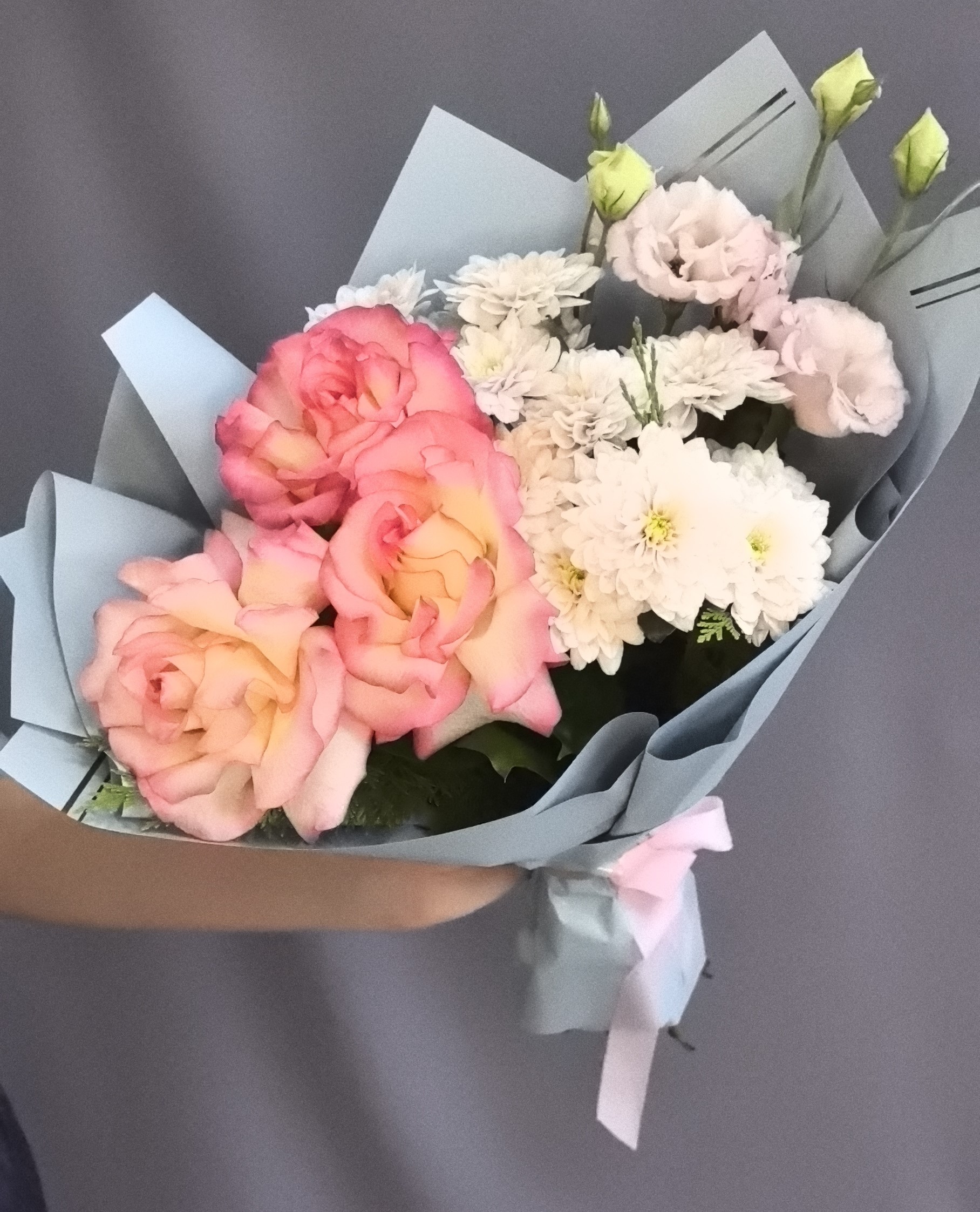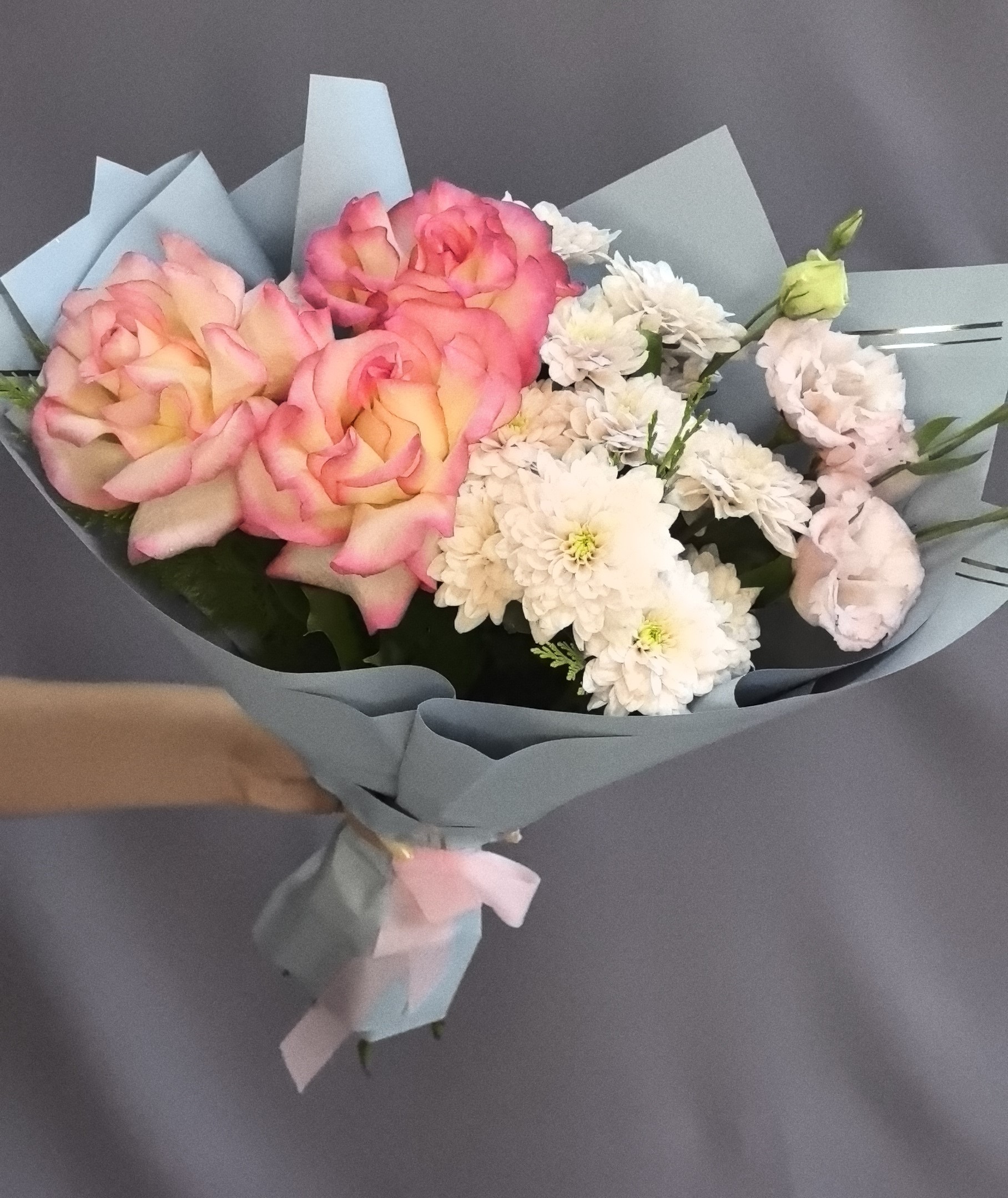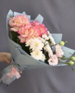 Изысканный букет, где нежные розы, воздушные хризантемы и утонченные эустомы создают гармоничную и романтичную композицию.