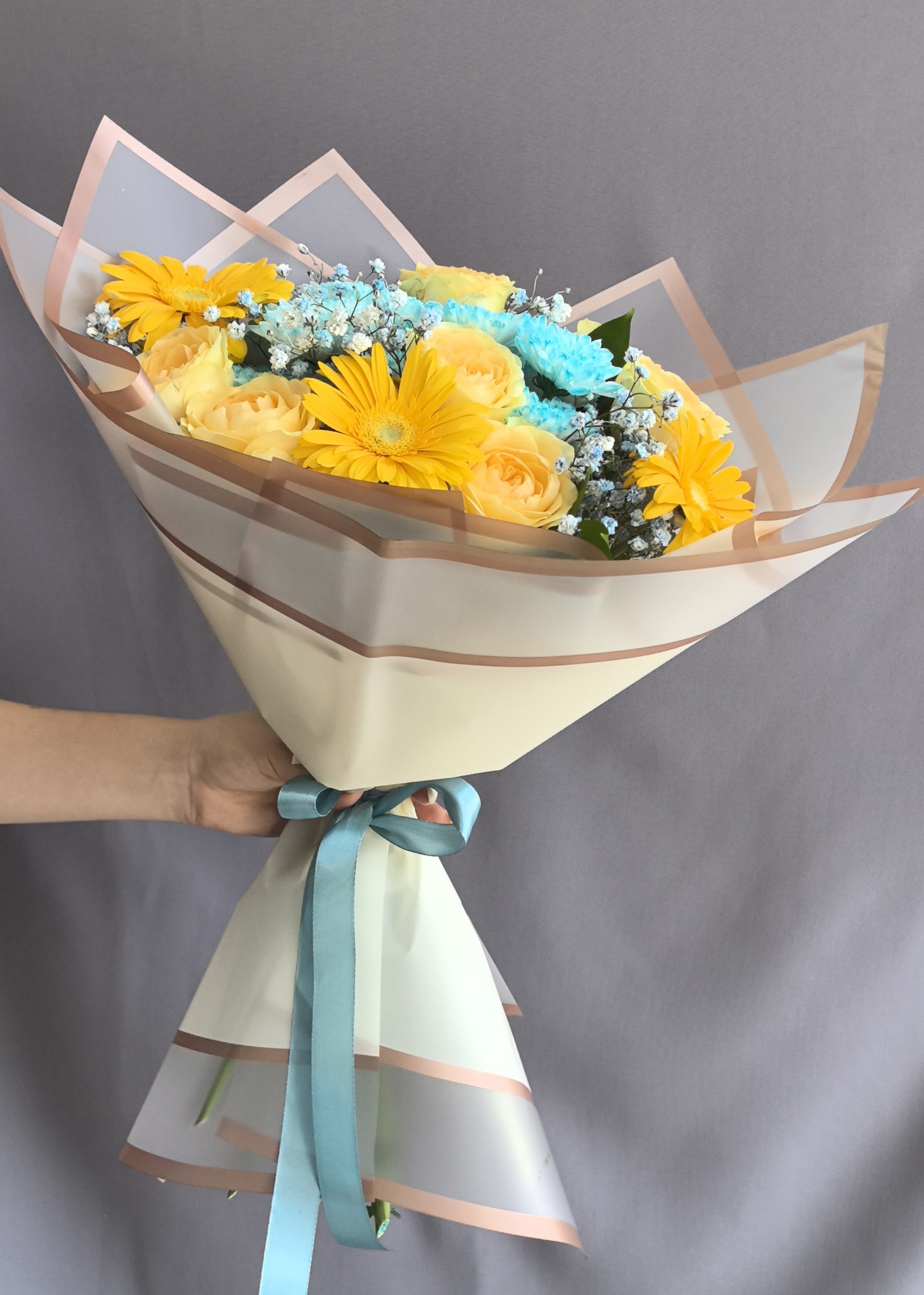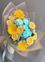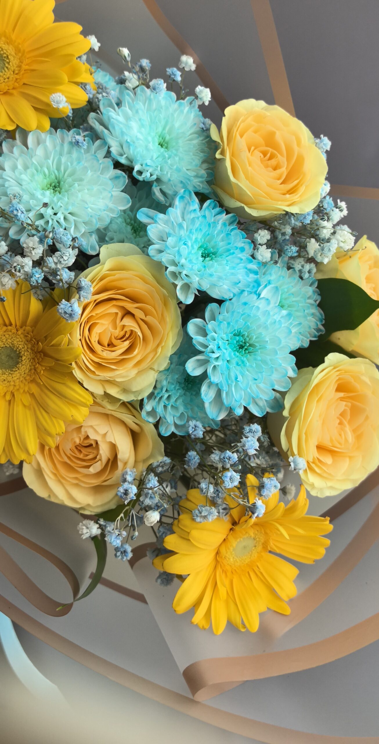 Сочный букет, в котором свежесть голубых хризантем гармонично сочетается с солнечной энергией желтых роз и оптимистичностью гербер. Эта композиция излучает жизненную силу и хорошее настроение.
