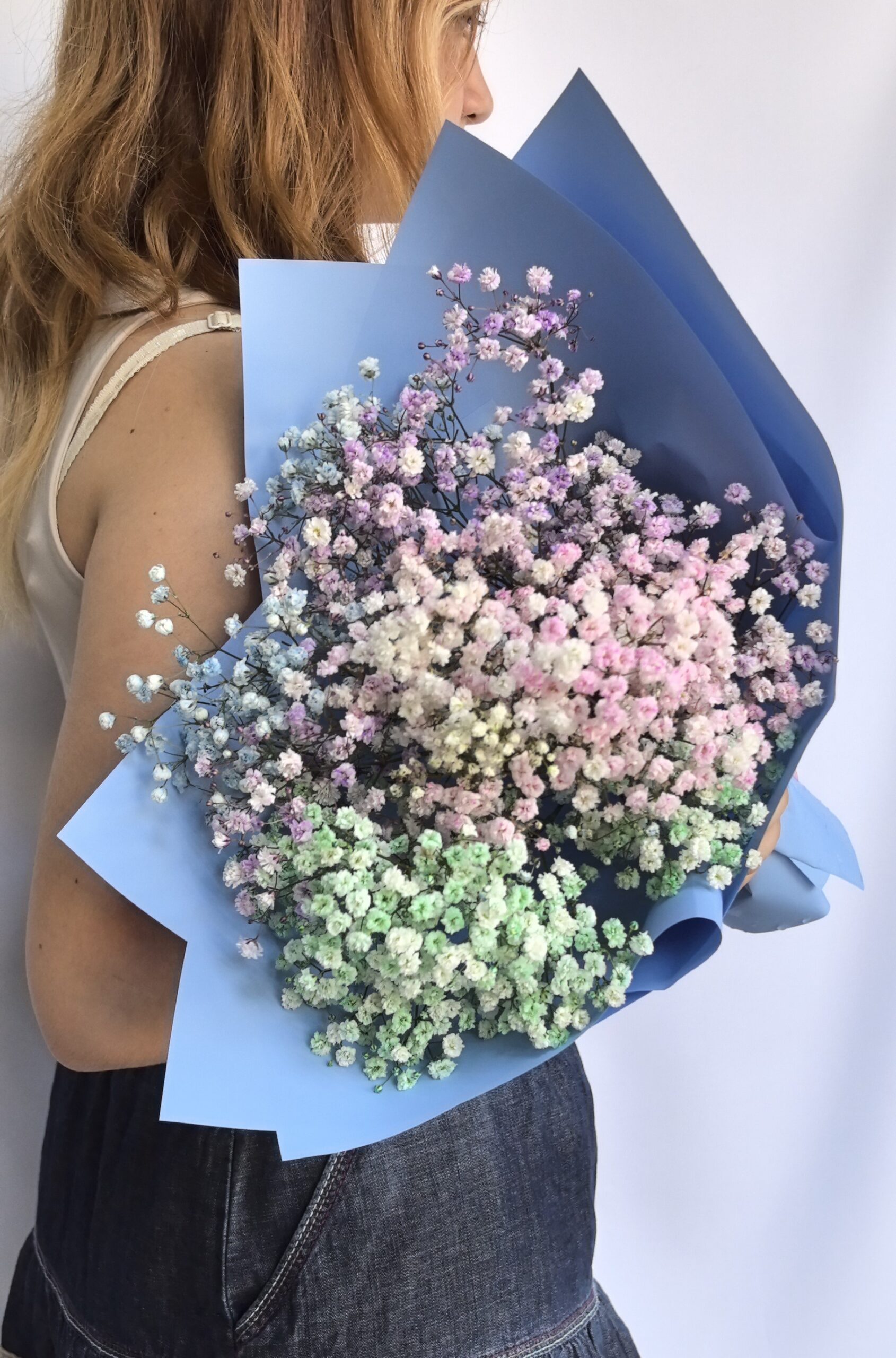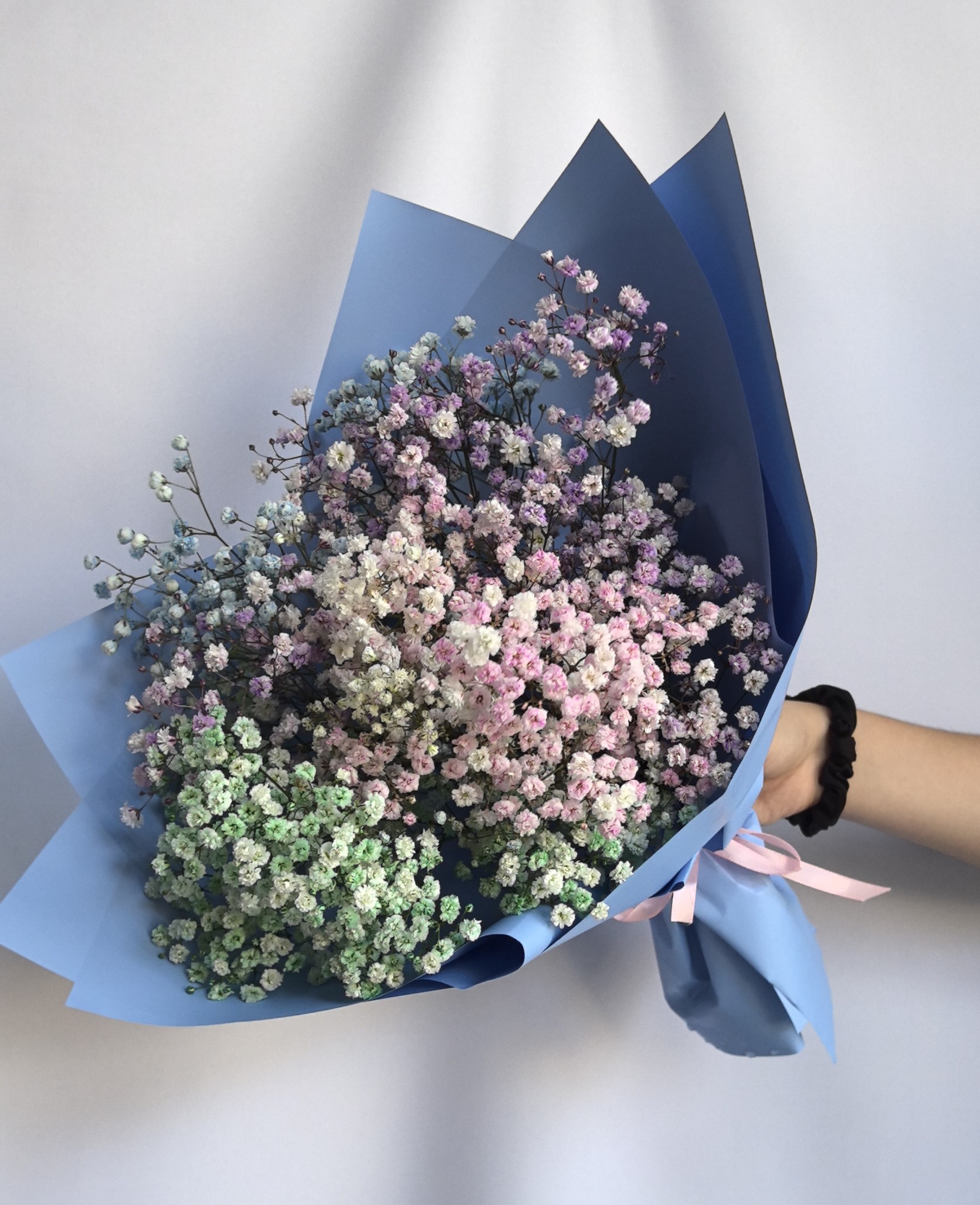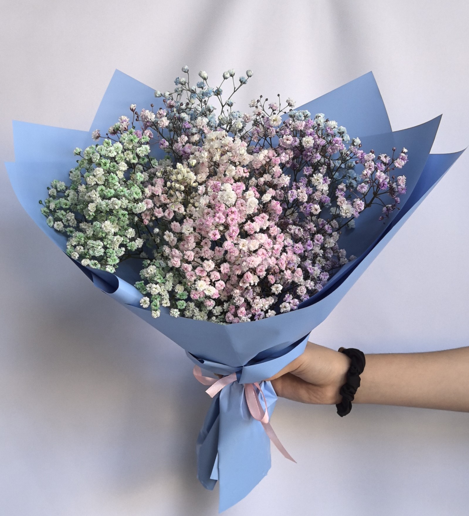 Букет из гипсофил, переливающийся всеми цветами радуги, напоминает воздушное облако, наполненное яркими красками. Он создаёт атмосферу праздника и волшебства.