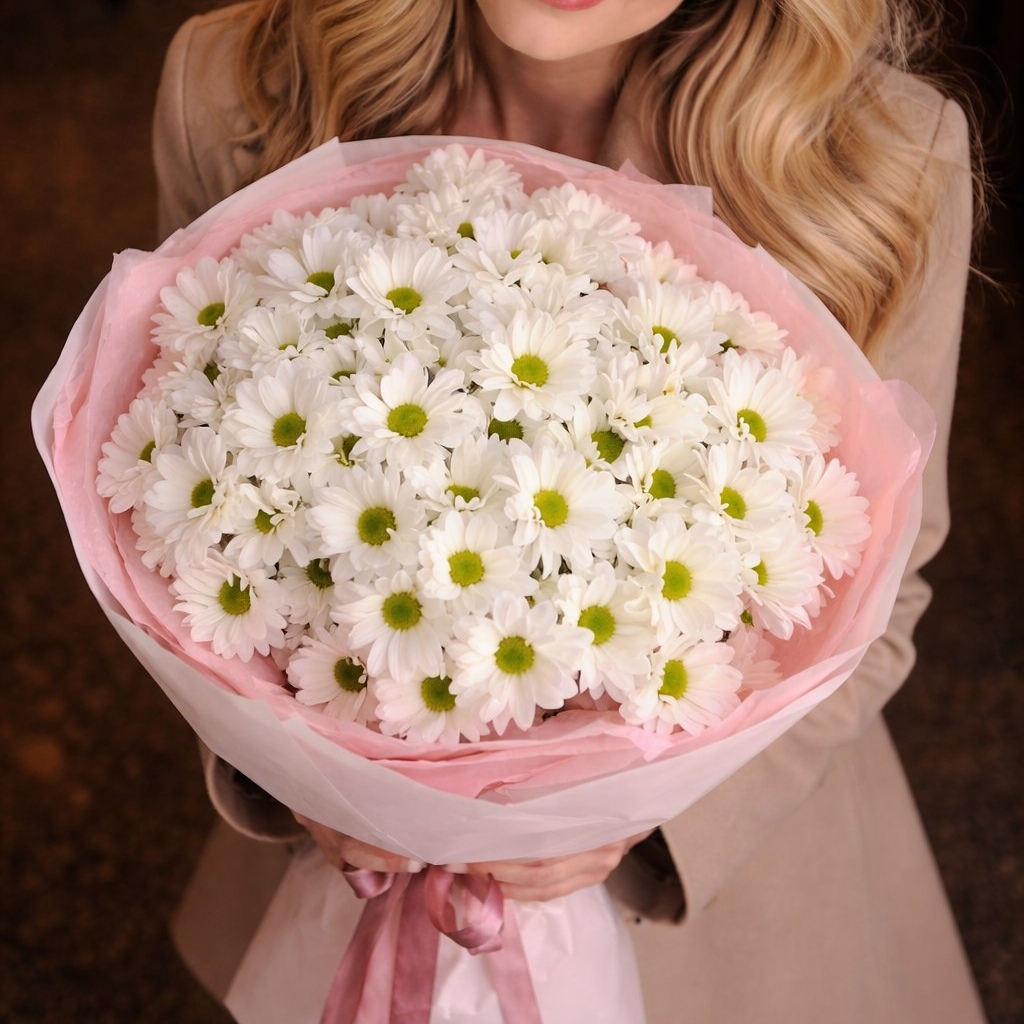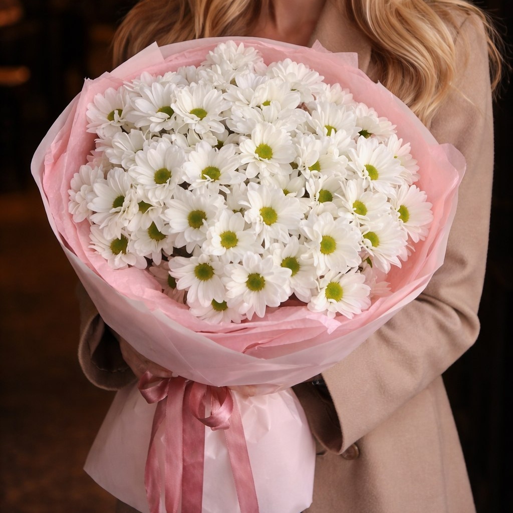 Нежность в каждом лепестке. Пышная охапка белоснежных кустовых хризантем, напоминающих полевые ромашки, окутана мягким облаком нежно-розовой упаковки. Этот букет создан для того, чтобы вызывать искреннюю улыбку и дарить ощущение весеннего утра. Легкий, воздушный и невероятно уютный — он станет лучшим признанием в симпатии или приятным сюрпризом без повода.
