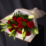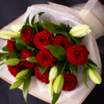 • Состав: 11 премиальные красные розы с бархатистыми лепестками, 3 ветки лилии с закрытыми бутонами, декоративная зелень.