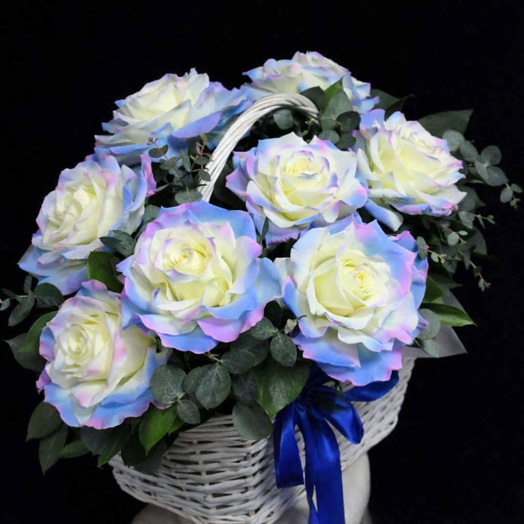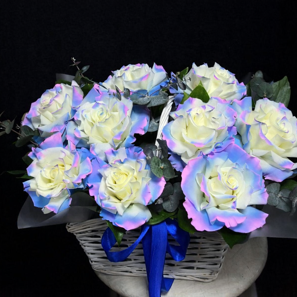 Эта композиция выглядит по-настоящему сказочно и необычно. Главная особенность здесь — уникальные градиентные розы, которые сразу привлекают внимание своей «космической» или «акварельной» расцветкой.