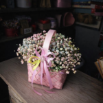 Корзина с радужной гипсофилой «Сердце к сердцу»