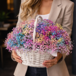 Объемная корзина с окрашенной гипсофилой премиум-класса. Композиция выполнена в белоснежной плетеной корзине, что подчеркивает яркость соцветий. Благодаря своей стойкости, этот подарок будет напоминать о вас неделями.