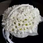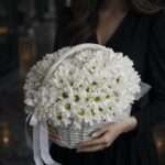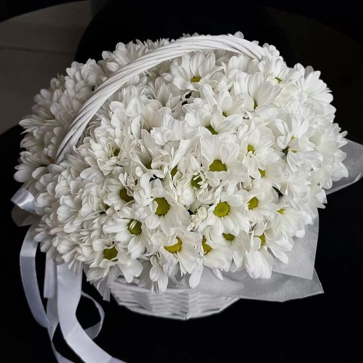 Классика, которая никогда не выйдет из моды. Пышная корзина белоснежных хризантем — это символ чистоты, искренности и глубокого уважения.