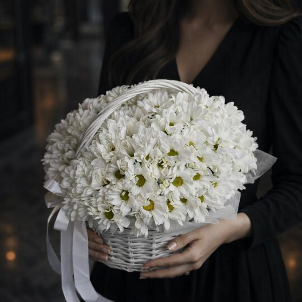 Корзина с белыми белыми хризантемами «Ромашковое лето»