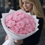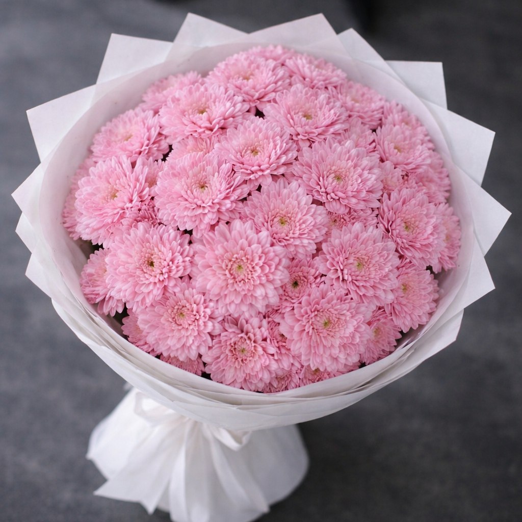 Воздушный букет из пышных розовых хризантем. Выглядит очень нежно и объемно. Лаконичная белая упаковка подчеркивает свежесть лепестков.