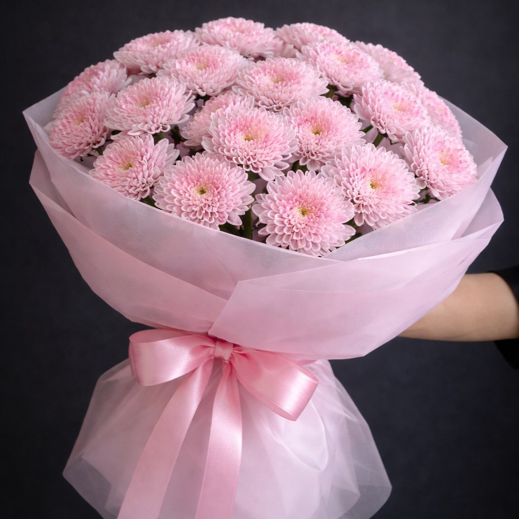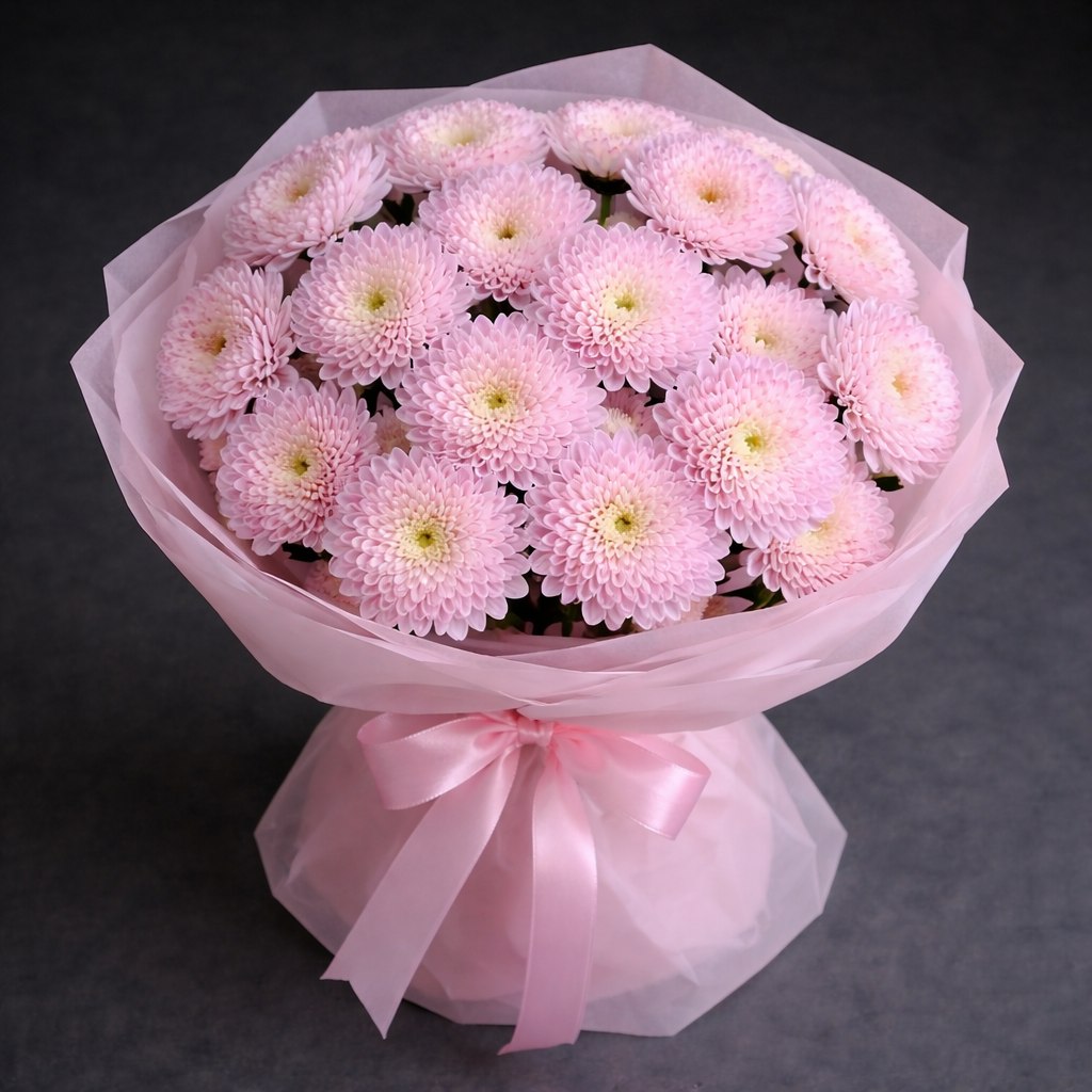Этот букет — как нежное объятие в цветочном исполнении. Пышные розовые хризантемы сорта «Алтай» в тончайшем розовом обрамлении создают эффект воздушного облака. Идеальный монохромный подарок для тех, кто любит стиль «aesthetic» и мечтательные оттенки. Такой букет расскажет о ваших чувствах без лишних слов и будет радовать своей свежестью невероятно долго!