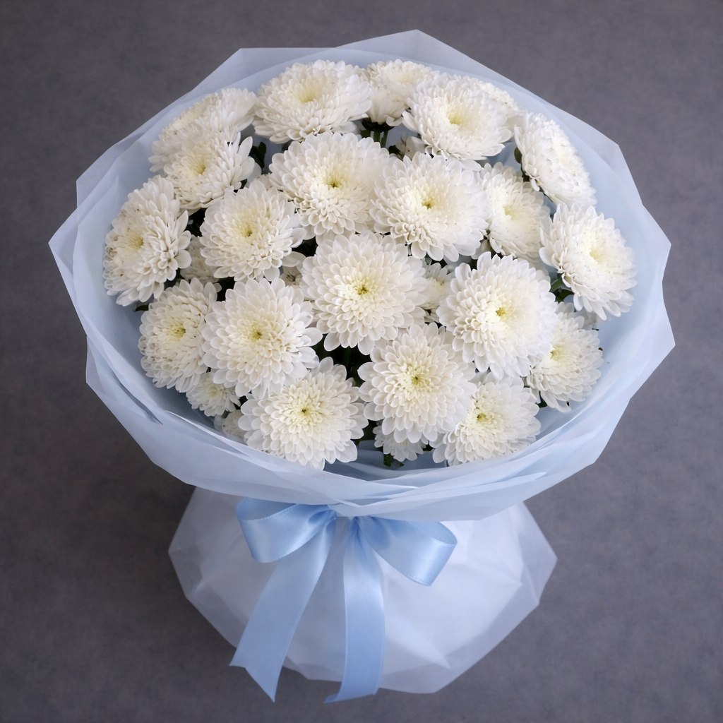 Букет-облако, который дарит спокойствие и улыбку. Белоснежные кустовые хризантемы — символ искренности и долголетия — собраны в пышную, фактурную композицию. Нежно-голубая матовая упаковка выигрышно подчеркивает белизну лепестков, создавая стильный и современный контраст.