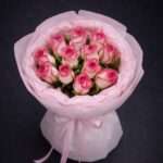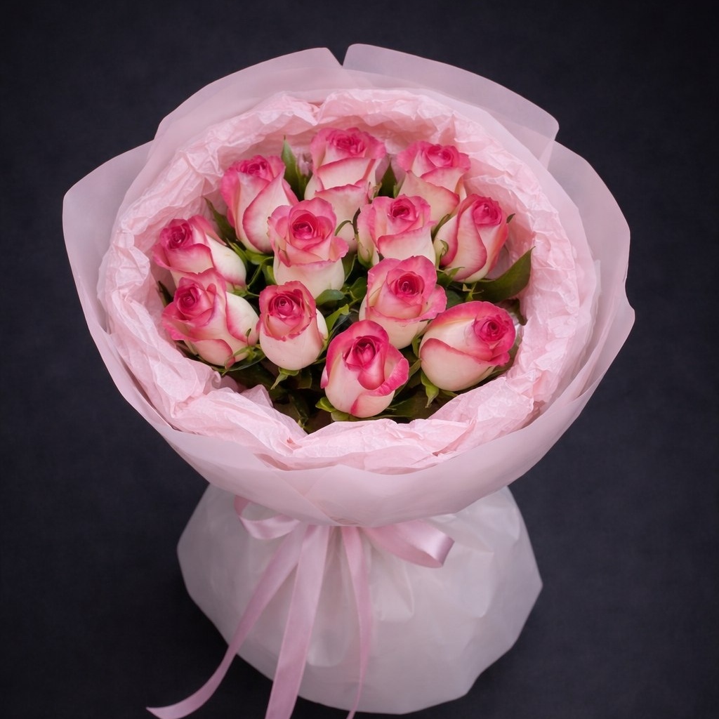 Цветы, которые говорят о чувствах без слов. В центре внимания — роскошные двухцветные розы с мягким переходом от кремово-белого к насыщенному малиновому краю. Этот букет похож на рассветное небо: нежный, но в то же время яркий и запоминающийся. Многослойная упаковка из полупрозрачной матовой бумаги создает эффект воздушного облака, подчеркивая хрупкость каждого лепестка. Идеальный подарок, чтобы вызвать искреннюю улыбку и оставить след в сердце.