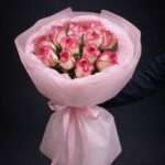 • Оформление: Стильная многослойная упаковка в тон бутонам, атласная лента.