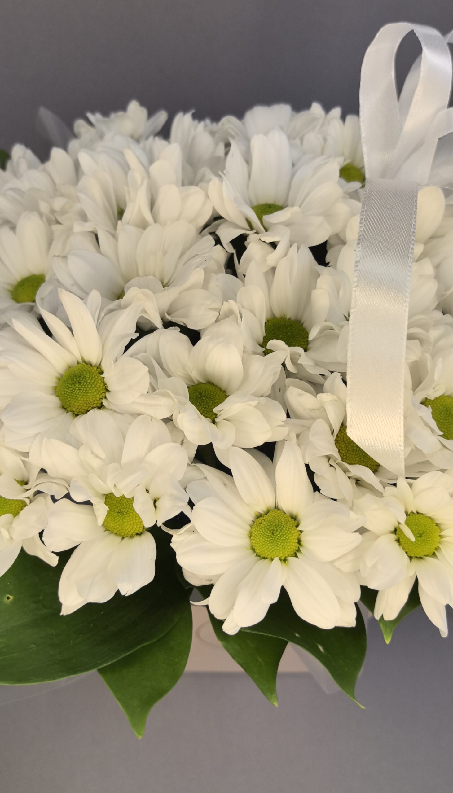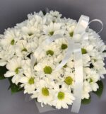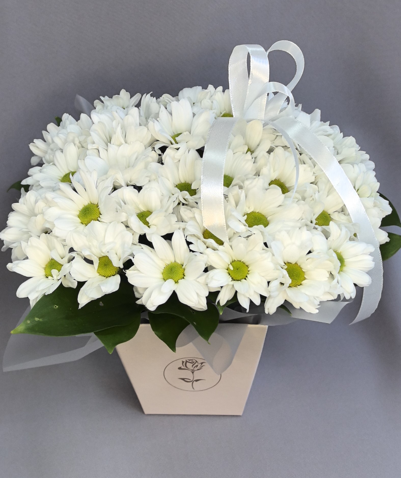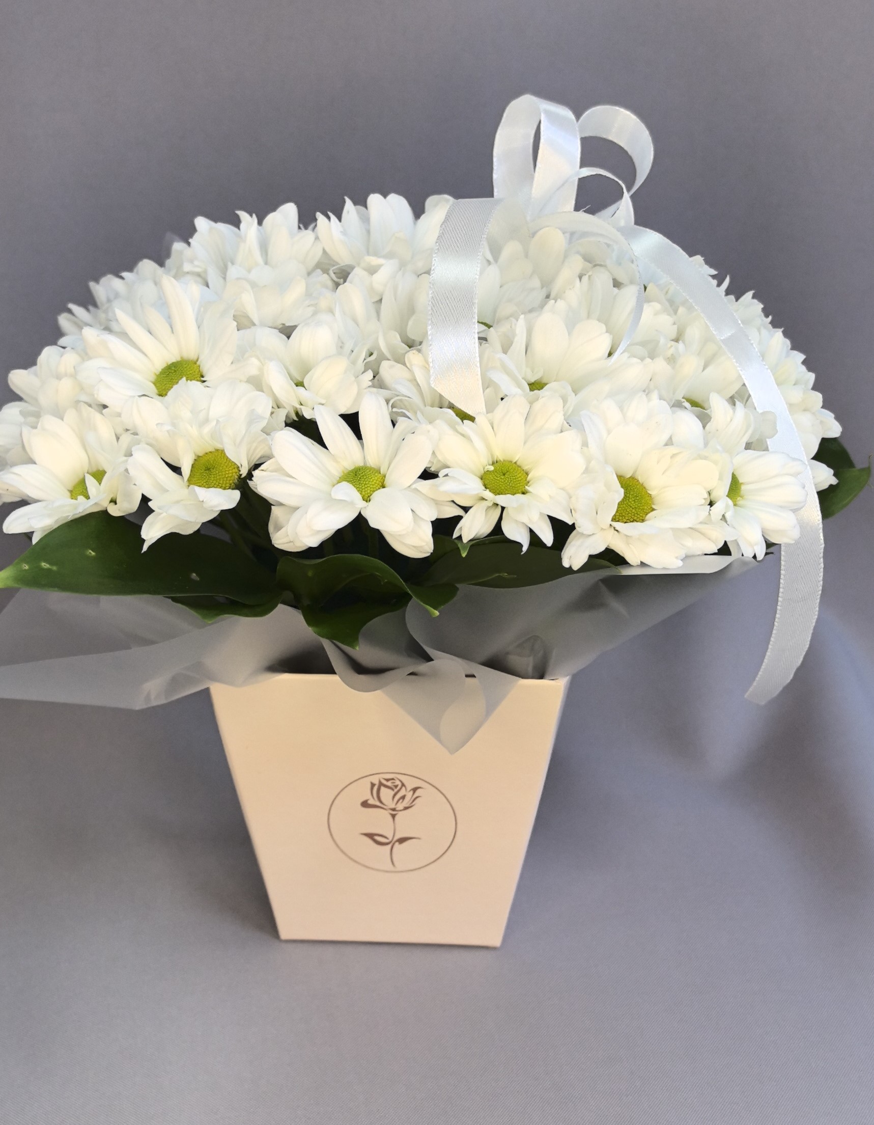 Изысканная композиция в коробке, где белоснежные хризантемы образуют трогательный и нежный букет, наполненный свежестью и природной простотой.