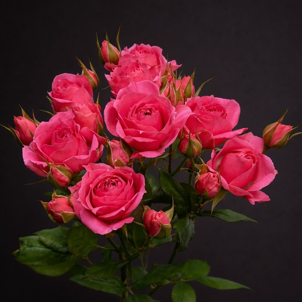 Перед нами настоящий праздник цветения. Насыщенный розовый цвет лепестков (оттенок фуксии или глубокой малины) выглядит невероятно сочно на контрастном темном фоне.