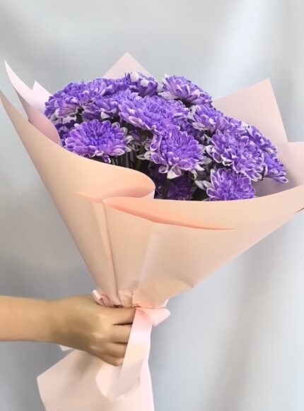 Элегантная сумка украшена розовыми эустомами и фиолетовыми хризантемами